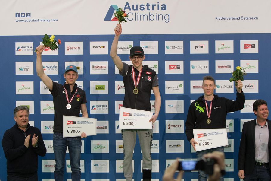 In einem packenden Kopf-an-Kopf-Rennen begeisterte Georg Parma (Naturfreunde Eichgraben) die volle Zuschauertribüne auf der Sport- & Fun-Messe in Ried im Innkreis und holte sich zwei Sekunden vor Ablauf der Zeit mit dem Top im letzten Boulder den Boulder-Staatsmeistertitel - vor Jakob Schubert und Elias Weiler (beide ÖAV Innsbruck)!