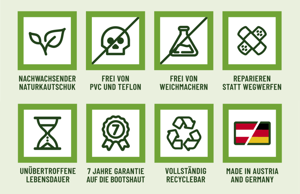 Durch ihr kleines Packmaß sind sie leicht zu transportieren und schnell einsatzbereit. Sie eignen sich für Seen, Flüsse und die Meeresküste und sind ideal, um die Natur entspannt und hautnah zu erleben. Die Boote werden aus nachwachsendem Naturkautschuk gefertigt und sind besonders langlebig sowie einfach zu reparieren.
