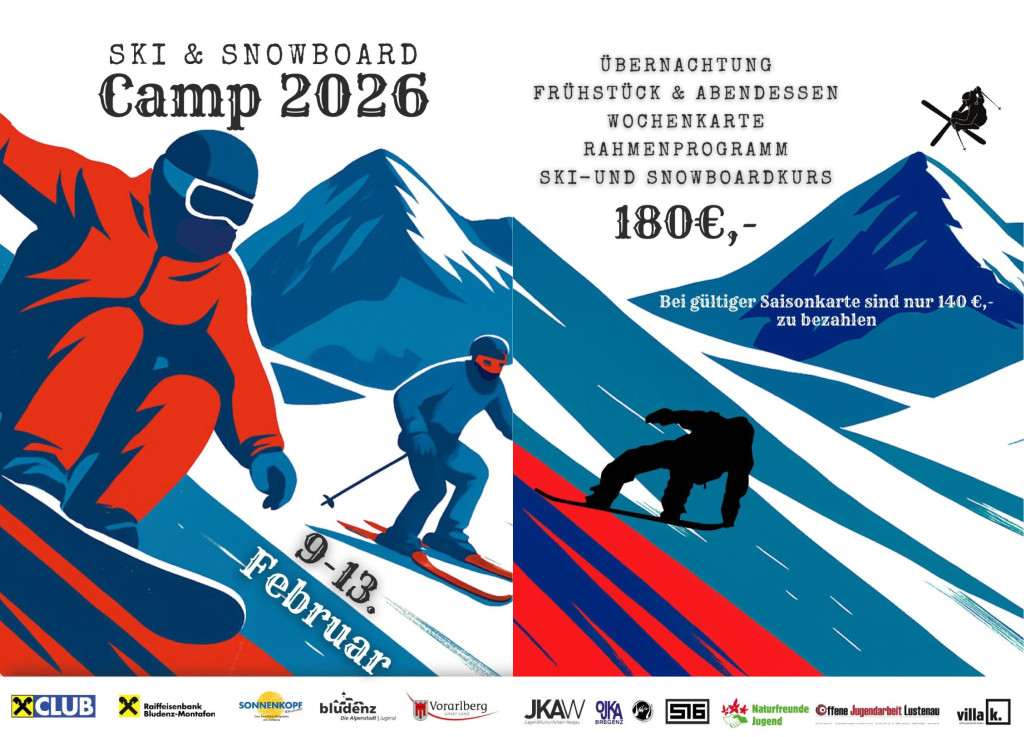 Bald steht das 33. Ski- und Snowboardcamp der Naturfreunde Jugend Vorarlberg in Kooperation mit der Offenen Jugendarbeit Vorarlberg bevor - eine aufregende Semesterferienwoche vom 9. bis 13. Februar 2026, für Jugendliche von 10 bis 18 Jahren, im Skigebiet Sonnenkopf im Klostertal.Für 180 Euro pro Person erwartet die Teilnehmer*innen nicht nur eine Wochenkarte für das Skigebiet, sondern auch Übernachtungen in der Villa K. in Bludenz. Frühstück und Abendessen sind ebenfalls inklusive. Das Ski- und Snowboardlehrer*innen-Team sorgen für sicheres Fahrvergnügen und ein abwechslungsreiches Rahmenprogramm. Tischtennis, Tischfußball, Spielabende, ein Besuch im Val Blu und ein Billardabend versprechen Unterhaltung bis in die Abendstunden.Factbox:Ski- und Snowboardcamp 2026Für Jugendliche im Alter von 10 - 18 Jahren Termin: Montag, 09. Februar bis Freitag, 13. Februar 2026 Ort: Sonnenkopf Klostertal und Villa K. Bludenz Kosten: nur 180 Euro pro Person inklusive Wochenkarte, Übernachtung in der Villa K. in Bludenz (Matratzenlager), Frühstück, Abendessen, Ski- und Snowboardlehrer*innen und vielseitigem Rahmenprogramm